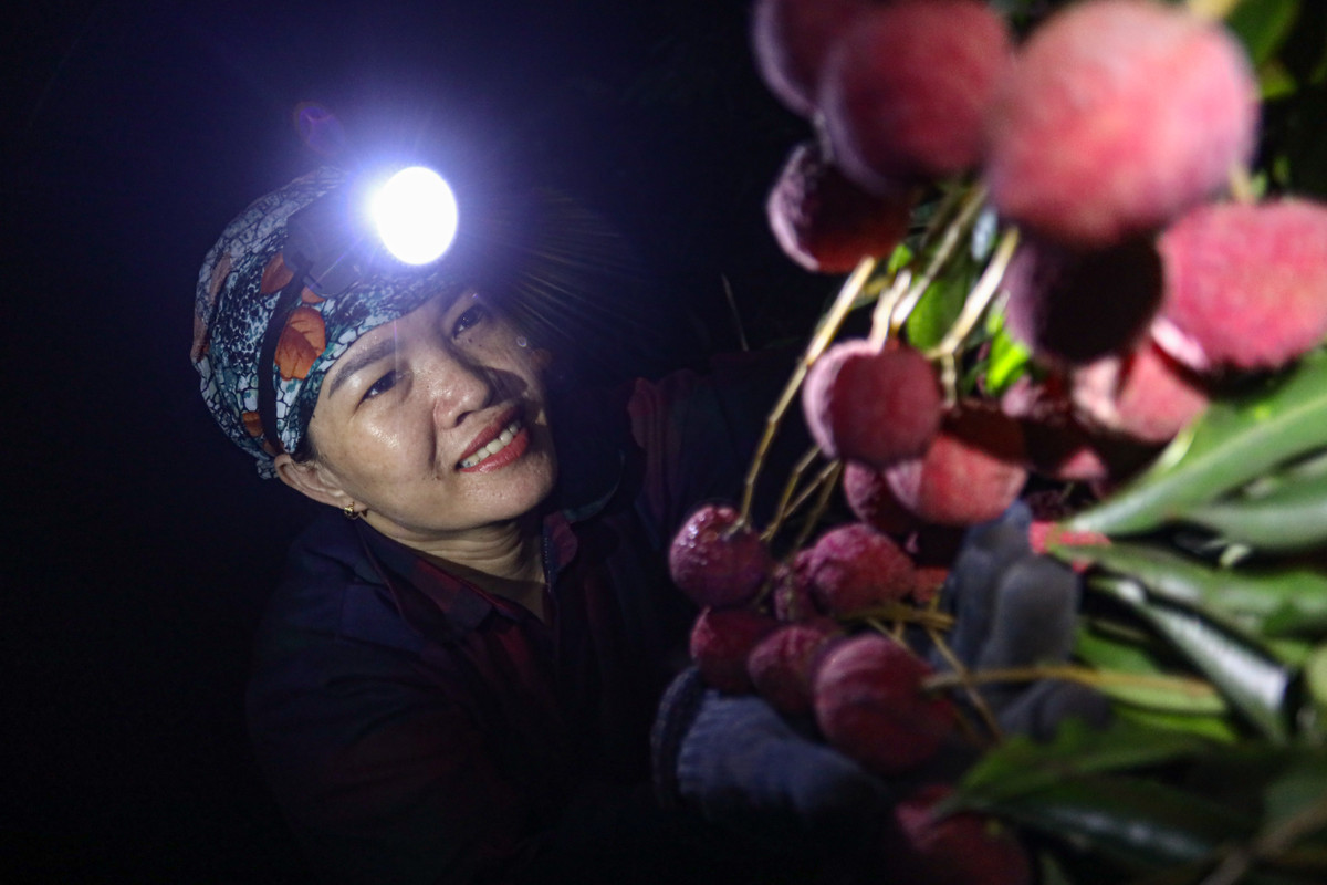 3h sáng 13/6 tại xã Biển Động, huyện Lục Ngạn,TP Bắc Giang, nhiều chủ vườn tất bật soi đèn đi thu hoạch vải, dù vất vả giữa đêm tối nhưng ai cũng vui vẻ vì năm nay trúng mùa.