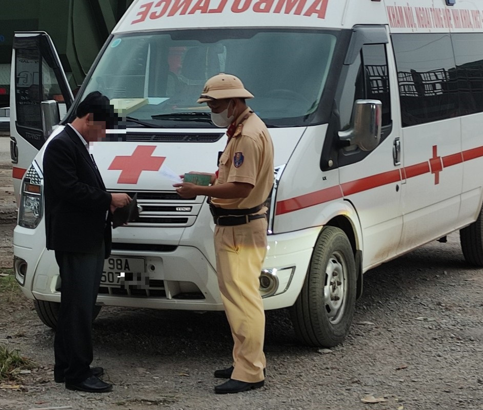 Trước đó, khoảng 15h40 ngày 6/11, Tổ công tác của Phòng Cảnh sát giao thông (Công an Bắc Giang) làm nhiệm vụ tuần tra kiểm soát, xử lý vi phạm tại Km 108+750 trên tuyến QL1A thuộc địa phận xã Tân Dĩnh (huyện Lạng Giang) đã kiểm tra ô tô cứu thương 98A-507.XX.