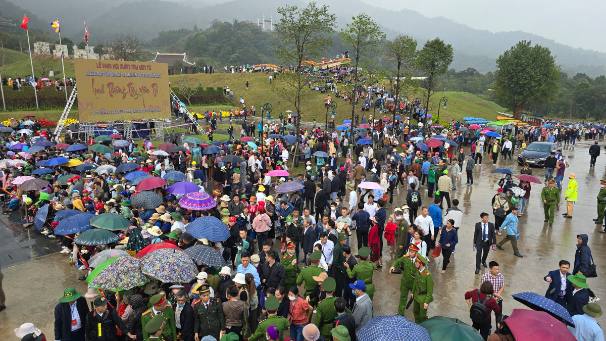 Dù sáng nay, trời mưa phùn nhẹ nhưng hàng ngàn người dân vẫn đội mưa về dự Lễ hội Xuân Tây Yên Tử và Tuần Văn hóa - Du lịch tỉnh Bắc Giang.