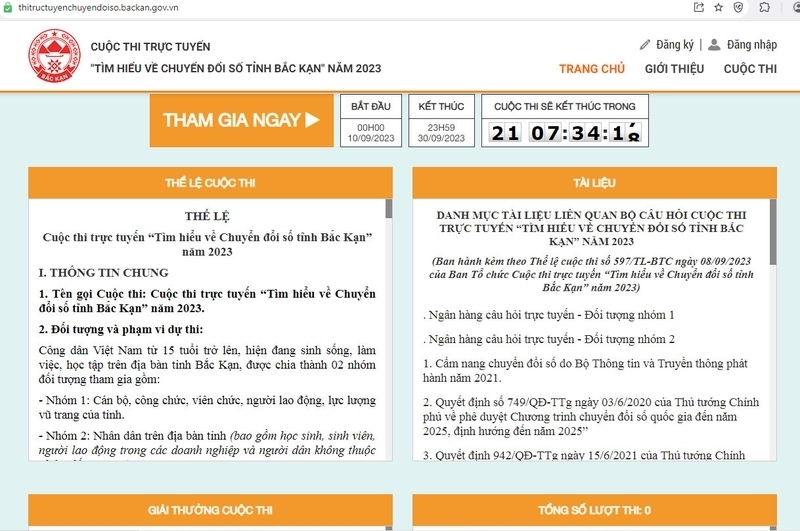 Để tham gia cuộc thi, người tham gia truy cập vào địa chỉ trang web https://thitructuyenchuyendoiso.backan.gov.vn thông qua máy vi tính hoặc các thiết bị di động có kết nối Internet để dự thi (đường link truy cập đồng thời được gắn trên trang/cổng TTĐT tỉnh và của các sở, ban, ngành, địa phương).