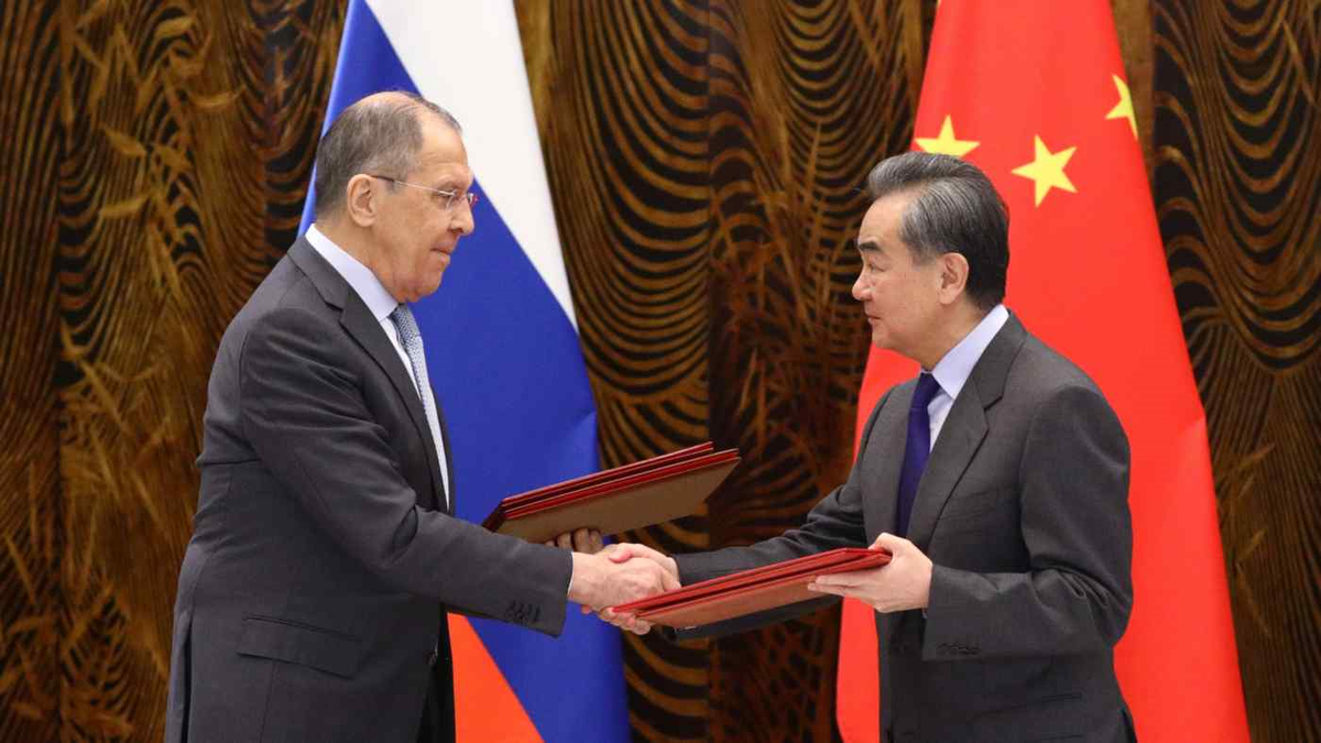 Ngoại trưởng Vương Nghị tiếp đón người đồng cấp Nga Sergey Lavrov tại Quảng Tây. (Ảnh: Reuters)