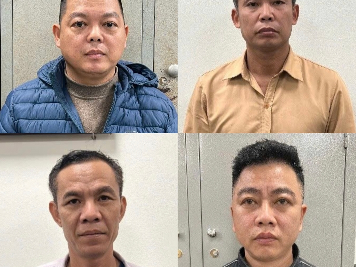 Bốn bị can gồm Man Thăng Long (sinh năm 1976, trú Hưng Yên), Tô Minh Quảng (sinh năm 1976, trú Quảng Nam), Vương Cường (sinh năm 1976, trú Hà Nội) và Mai Văn Cường (sinh năm 1983, trú Tuyên Quang).