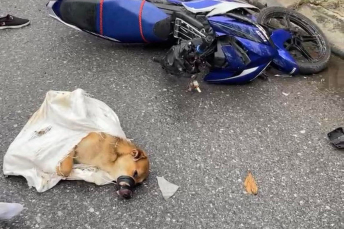 Tại hiện trường, bên cạnh hai thanh niên đi xe máy bị ngã ra đường còn có một con dao, một dây thòng lọng, một bao tải đã rách bên trong có một con chó to bị thương.