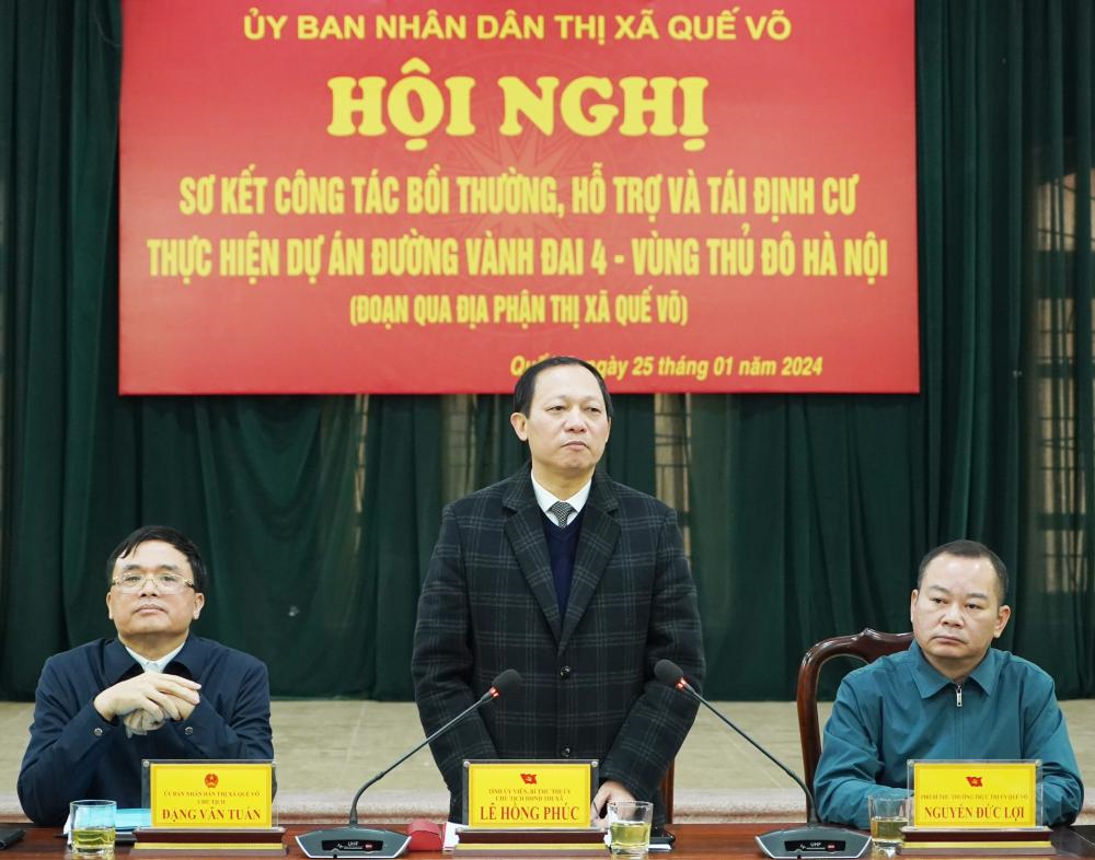 Phát biểu tại hội nghị sơ kết công tác bồi thường, hỗ trợ và tái định cư thực hiện dự án đường vành đai 4 - vùng Thủ đô (Đoạn qua địa phận thị xã Quế Võ), ông Lê Hồng Phúc, Bí thư Thị ủy, Chủ tịch HĐND thị xã Quế Võ đánh giá cáo kết quả giải phóng mặt bằng phục vụ dự án đường Vành đai 4.