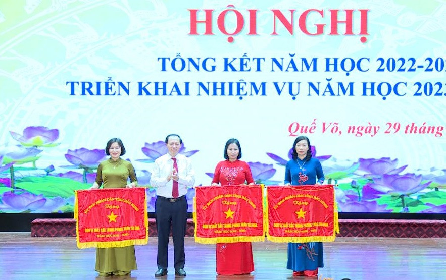 Lãnh đạo Sở Giáo dục và Đào tạo tỉnh Bắc Ninh tặng Bằng khen của chủ tịch UBND tỉnh cho các tập thể có thành tích trong năm học 2022-2023. (Ảnh: TX Quế Võ).
