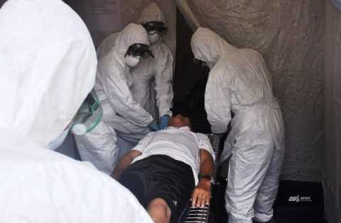 | Tình huống giả định những bệnh nhân trong vùng dịch Ebola đang được các bác sĩ điều trị, khử khuẩn |