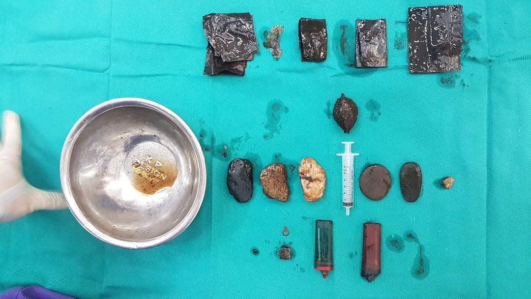 Theo PGS.TS Nguyễn Đức Chính - Trưởng khoa Phẫu thuật Nhiễm khuẩn, Bệnh viện Hữu nghị Việt Đức, người trực tiếp phẫu thuật cho bệnh nhân, quá trình phẫu thuật, cả kíp mổ đều "hoảng hốt" khi phát hiện trong dạ dày bệnh nhân có rất nhiều dị vật như bật lửa, đá, sỏi, túi nilon, hạt bàng…Hầu hết màu đen do nằm lâu trong dạ dày.