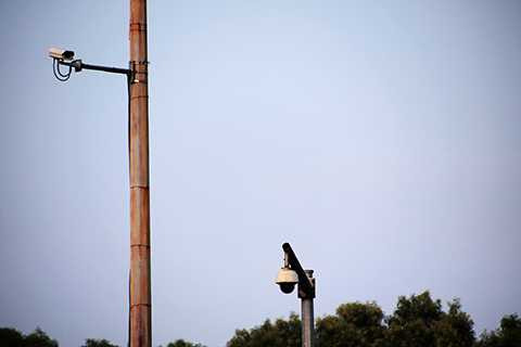 | Chiếc camera hình chữ nhật là của Công an Hà Nội, còn chiếc hình cầu, treo thấp hơn là của VOV |