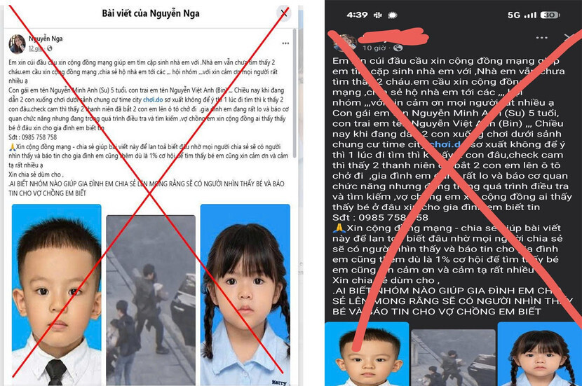 Cùng ngày, nhiều trang mạng xã hội chia sẻ bài viết về việc “bắt cóc 2 trẻ em tại khu vực Times City (Vĩnh Tuy)”. Người đăng kể mình đưa 2 con xuống sảnh chơi, do sơ suất không để ý nên sau đó không thấy 2 bé đâu. Người này còn khẳng định có xem camera và thấy 2 thanh niên đưa 2 cháu bé lên ô tô chở đi.