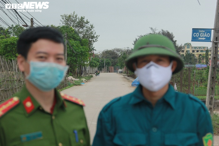 Lực lượng chức năng đứng chốt tại thôn Xâm Xuyên (xã Hồng Vân) để khoanh vùng xác minh các trường hợp tiếp xúc với bệnh nhân T. ở thôn Xâm Thị.