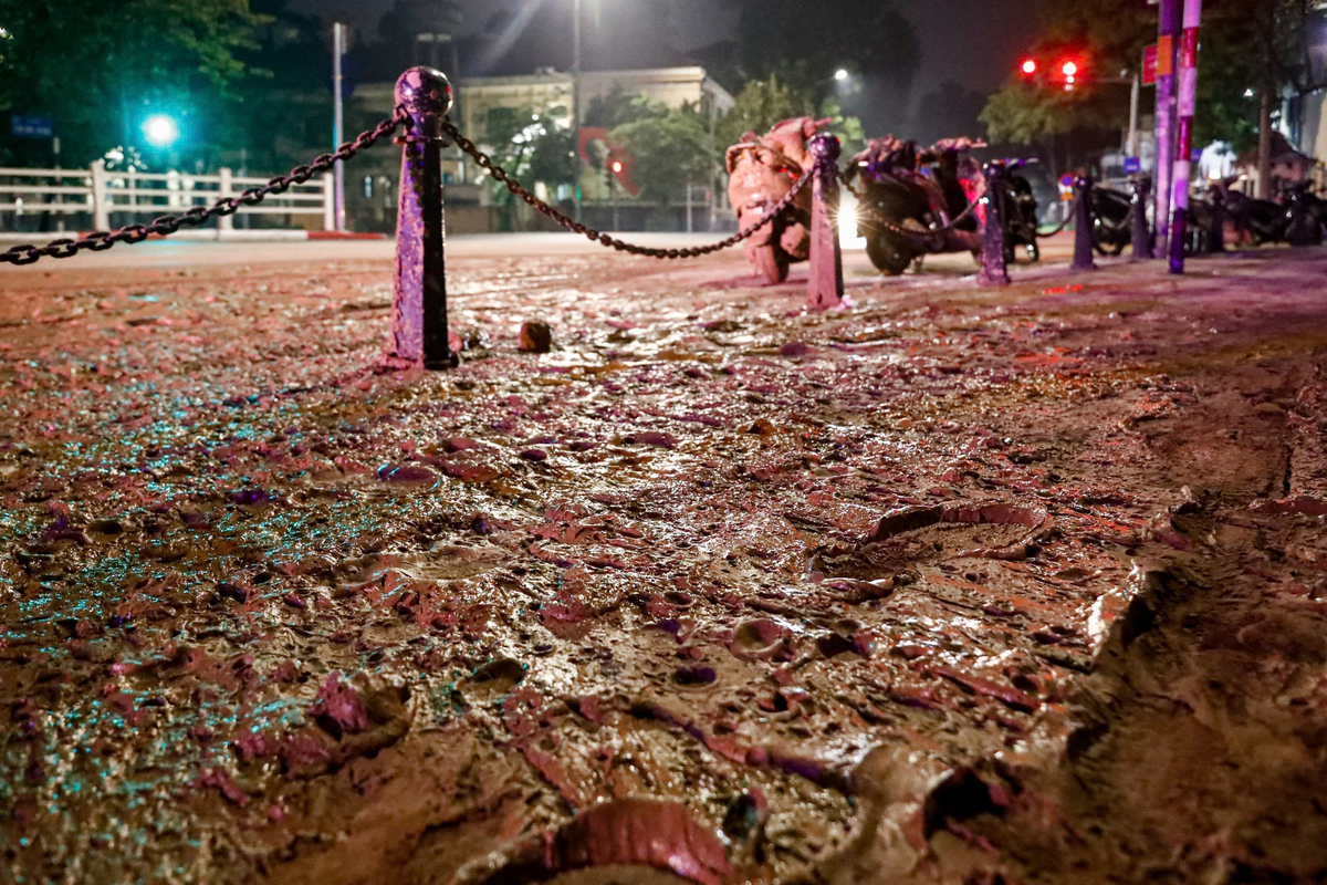 Trước đó, tối 16/11, hàng loạt người đi xe máy ngã ra đường vì lớp bùn dày tại khu vực ngã tư Tôn Đức Thắng - Nguyễn Thái Học (phường Văn Miếu - Quốc Tử Giám).