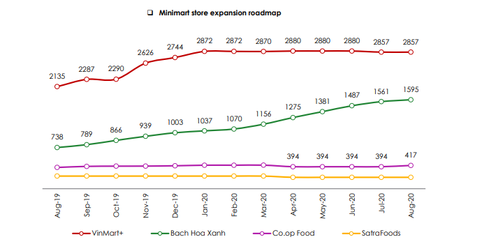 Theo báo cáo số lượng cửa hàng tháng 8/2020 từ số liệu trên Website của các nhà bán lẻ, Nielsen chỉ ra, phân khúc Minimart (với 5.263 cửa hàng) đang chiếm hơn một nửa thị trường kênh bán lẻ hiện đại cả nước (xét về số lượng), tăng trưởng 44% so với cùng kỳ năm ngoái. Trong đó, Bách hoá Xanh dẫn dắt sự tăng trưởng số lượng cửa hàng từ tháng 3/2020.