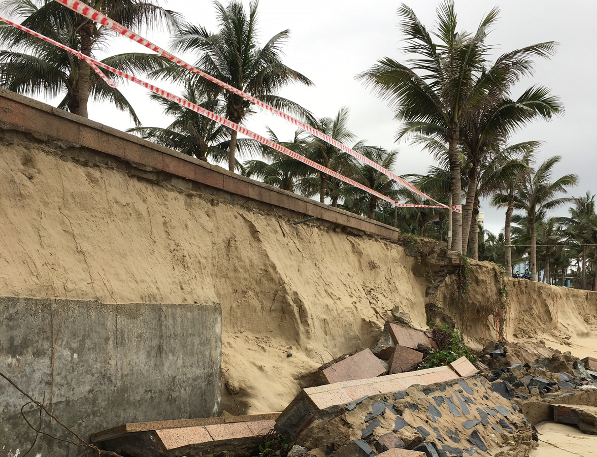 Hàng trăm mét bờ biển Đà Nẵng bị xâm thực và có nguy cơ tiếp tục sạt lở sâu vào tuyến đường Hoàng Sa-Võ Nguyên Giám-Trường Sa nếu không được gia cố, khắc phục.
