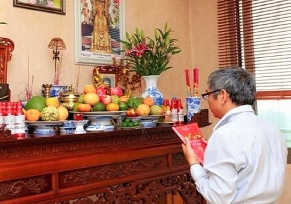 "Con lạy chín phương trời, mười phương Phật, chư Phật mười phương. Con kính lạy Hoàng thiên hậu thổ, chư vị tôn thần. Con kính lạy ngài bản cảnh thành hoàng, ngài bản xứ thổ địa, ngài bản gia táo quân cùng chư vị tôn thần.