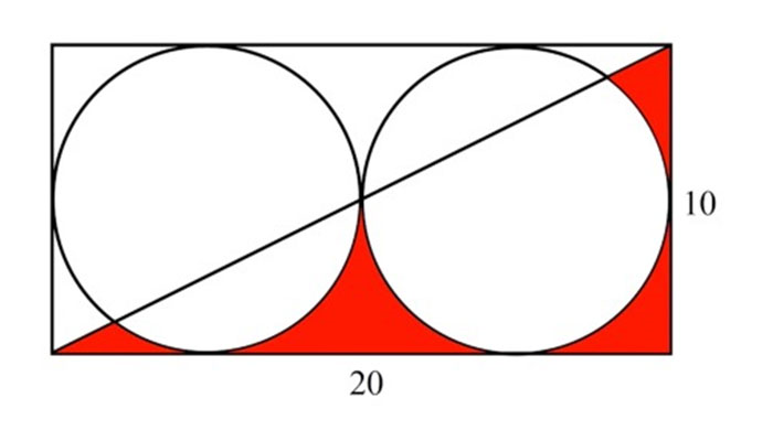 Hai hình tròn cùng kích thước tiếp xúc nhau và tiếp xúc các cạnh hình chữ nhật có độ dài lần lượt là 20 và 10 như hiển thị, tính diện tích hình màu đỏ.