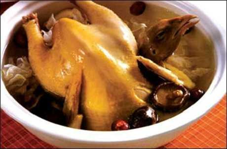Gà ác một con, táo tàu đen 10 quả, hoài sơn (củ mài) 15g, kỷ tử 10g, ý dĩ 30g, vài củ hành tím, gia vị vừa đủ. Gà làm sạch, để nguyên con. Hành tím bóc vỏ, nướng chín; ý dĩ ngâm nước cho nở; ngâm táo tàu 10 phút, vớt ra để ráo. Đặt gà vào thố sứ, cho táo và ba vị kia vào, đổ nước vừa bằng, đậy nắp thố, chưng cách thủy chừng một tiếng rưỡi. Nêm ít đường, muối, rồi thả hành tím nướng vào. 30 phút sau ăn được, rắc ít tiêu bột cho thơm. Ăn nóng, mỗi ngày một lần, từ 7 - 10 ngày.