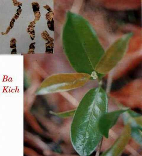 Ba kích hoàn: ba kích (bỏ lõi) 30g, sơn thù 30g, xà sàng tử 30g, phục linh 30g, sơn dược 30g, viễn chí (bỏ lõi) 30g, đỗ trọng 30g, ngưu tất (tẩy rượu) 30g, ngũ vị tử 30g, thỏ ty tử (tẩm rượu) 30g, tục đoạn 30g, nhục thung dung (tẩm rượu) 60g, ích trí nhân 30g.