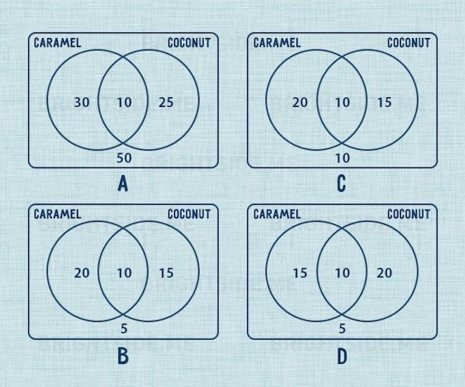 Bài toán như sau: Có 50 viên socola trong hộp, trong đó có 30 viên nhân caramel, 25 viên nhân dừa, 10 viên mix nhân caramel và dừa, số còn lại là socola không nhân.
