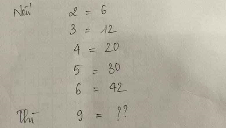 Mới đây, tài khoản Facebook chia sẻ hình ảnh là câu hỏi dạng bài toán IQ thu hút sự chú ý của nhiều người. Câu hỏi như sau: "Nếu 2=6, 3=12, 4=20, 5=30, 6=42 thì 9=?".