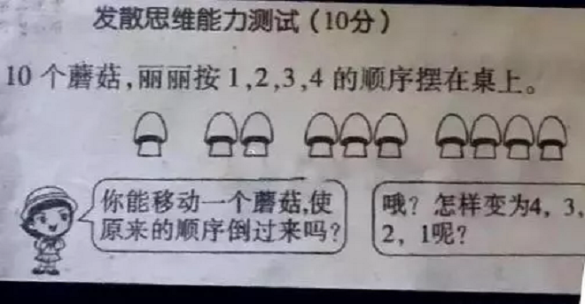 Tờ Rwgreatdaily giới thiệu bài toán đố: Các đống nấm được xếp theo thứ tự 1 (cây) - 2 (cây) - 3 (cây) - 4 (cây). Hỏi làm thế nào để di chuyển 1 câu nấm mà đảo lộn hoàn toàn thứ tự này thành 4 -3 - 2 -1.