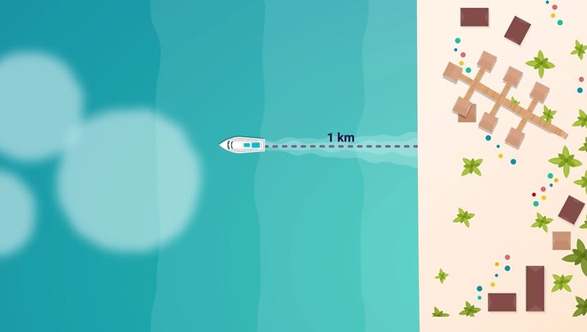 Một ngư dân chèo thuyền ra biển theo hướng vuông góc với bờ. Sau khi ông ta đi được 1 km, biển bắt đầu xuất hiện màn sương dày đặc khiến người này không thể quan sát.