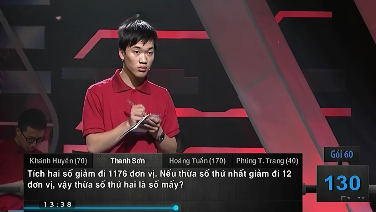 Trong phần thi về đích của chương trình Đường lên đỉnh Olympia, thí sinh Thanh Sơn phải đối mặt với câu đố Toán học cực khó trong gói câu hỏi 60 điểm. Câu hỏi nội dung như sau: "Tích hai số giảm đi 1.176 đơn vị. Nếu thừa số thứ nhất giảm đi 12 đơn vị, vậy thừa số thứ hai là số mấy?".
