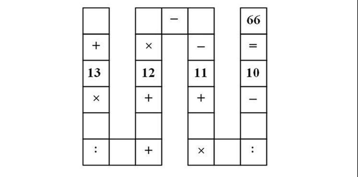 Hãy điền các số từ 1 đến 9 vào các ô trống còn thiếu trong hình. Sử dụng các phép toán đã được xác định và các giá trị được chèn vào, ta có kết quả cuối cùng là 66.