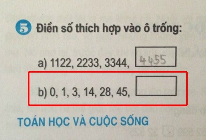 Ở câu a, có thể dễ dàng tìm được đáp án với dãy số: “1122, 2233, 3344″ => số tiếp theo là “4455″. Tuy nhiên đến câu b thì không đi theo trình tự sắp xếp các con chữ như câu đầu tiên nữa: “0, 1, 3, 14, 28, 45, ?”.