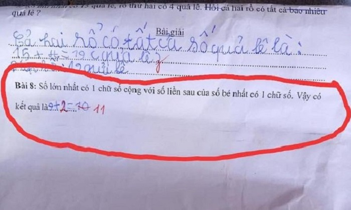Đáp án học sinh đưa ra là 9 + 1 = 10. Trong đó 9 là số lớn nhất có một chữ số, 1 là số liền sau của số bé nhất có một chữ số (là số 0). Tuy nhiên cô giáo gạch số 1 mà sửa thành số 2, tức là phép tính đúng theo cô giáo là 9 + 2 = 11.