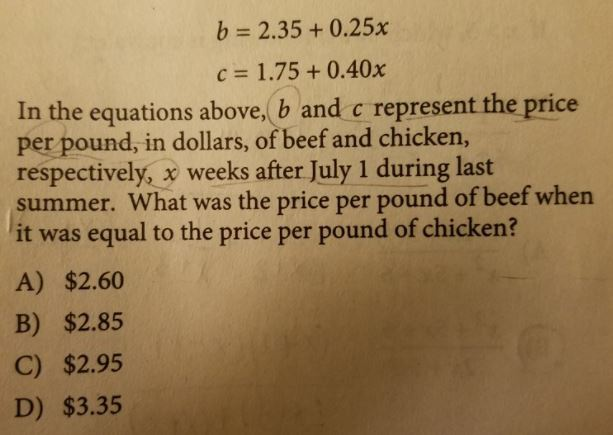 Trong đó, b và c lần lượt là giá của 1 pound (gần 454 gram) thịt bò và thịt gà, tính theo đơn vị USD, x là số tuần của mùa hè, tính từ 1/7.