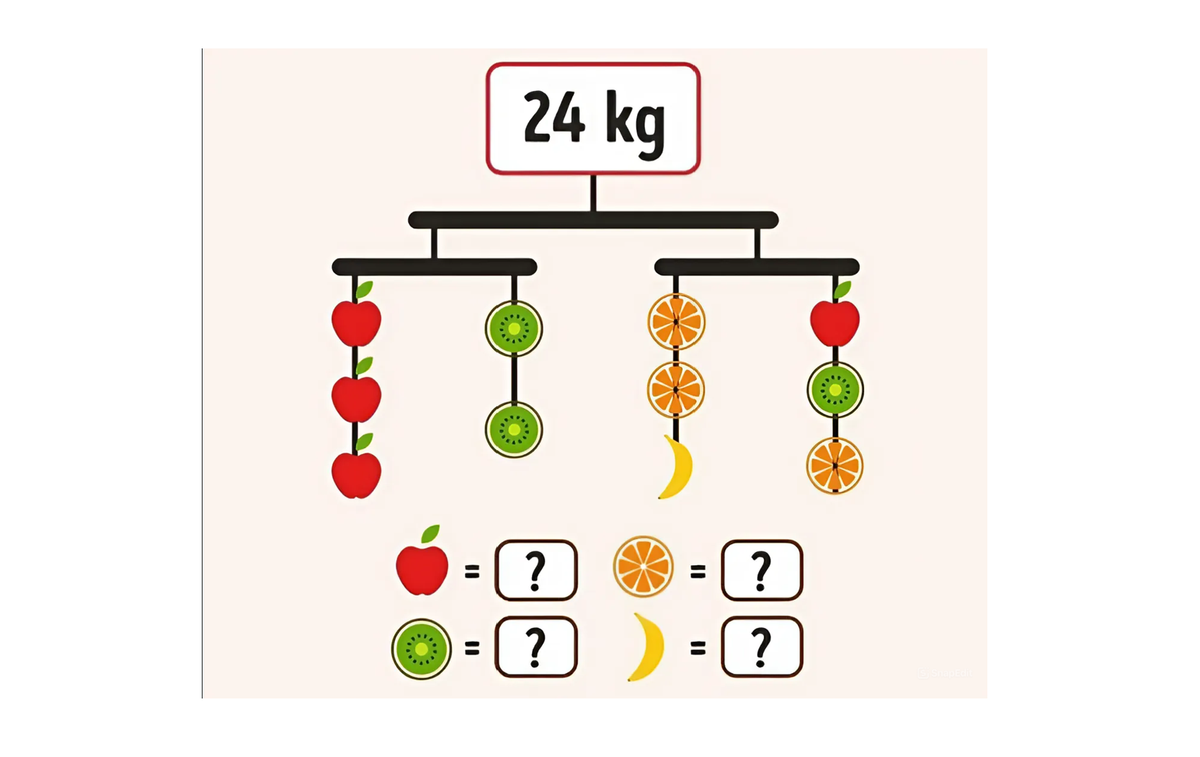 Bài toán yêu cầu tính trọng lượng từng loại trái cây: Táo, cam, chuối, kiwi, với tổng trọng lượng biết trước là 24kg. Nếu nhìn lướt qua bạn sẽ nghĩ đây là thử thách đơn giản chỉ với vài bước đã tìm ra đáp án, nhưng thực sự là câu hỏi khiến bạn phải mất nhiều thời gian để tìm được ra lời giải chính xác nhất.