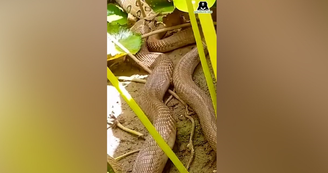 Tổ chức giải cứu động vật hoang dã Wildlife SOS được gọi tới trang trại Madhu ở Kalali, nơi con rắn hổ mang Ấn Độ ăn thịt con rắn lục dài 1,5 m sau trận tử chiến khốc liệt.