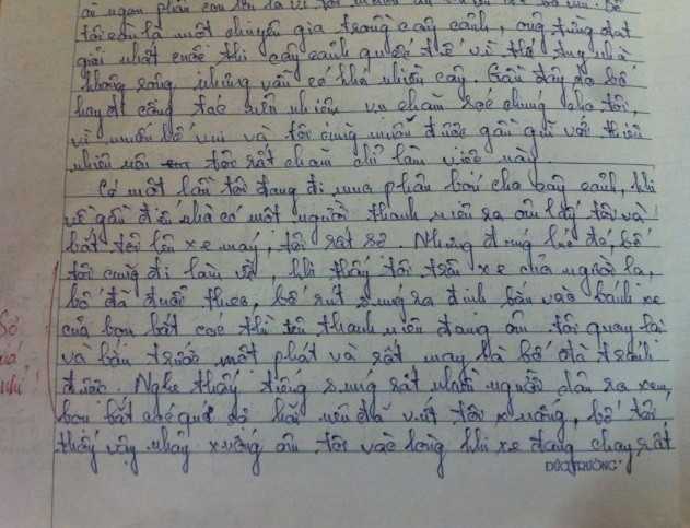 Tuy nhiên, đến phần chính học sinh này lại viết theo giọng truyện kiếm hiệp như sau: “Tôi nghe mẹ tôi kể hơn 20 năm trước chính bố đã giải cứu mẹ khỏi một bang cướp giết người cướp của. Bố mặc sự hiểm nguy chính mình đã lần theo bang cướp và dùng võ Kungfu đánh tan bang cướp có vũ trang và giải cứu đám con tin an toàn.