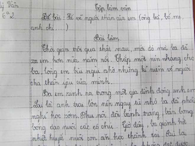 Đó là bài tập làm văn kể về người cha của mình của em Ngô Thanh Mỹ Vân (học sinh lớp 6A2 Trường THCS Độc Lập, quận Phú Nhuận, TP HCM) em ngậm ngùi với những kỷ niệm về người cha là công nhân thân yêu của mình cũng như những ước mơ, hoài bão, những lời dặn dò của cha em trước khi gặp nạn.