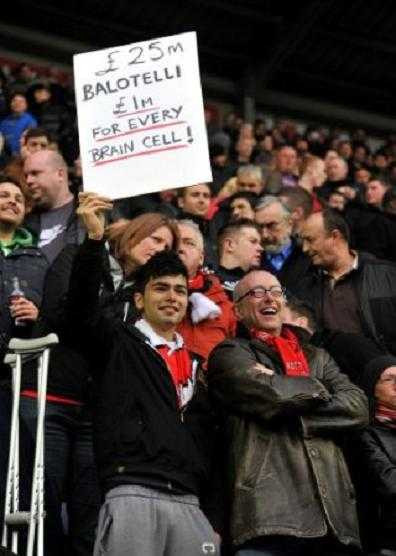 Nguyên nhân của tất cả nỗi thất vọng mang tên Super Mario ấy có thể đến từ chính các cổ động viên đội khách Manchester United. Cầu thủ gốc Ghana là mục tiêu la ó và chế giễu từ phía khán đài trong suốt thời gian diễn ra trận đấu. Thậm chí những người hâm mộ MU còn dành hẳn cho anh một tấm biểu ngữ với dòng chữ: “25 triệu bảng cho Balotelli và 1 triệu bảng cho mỗi mảnh não của anh ta”.