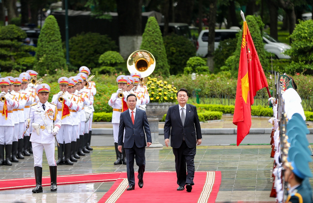 Lễ đón Tổng thống Hàn Quốc Yoon Suk-yeol được tổ chức tại Phủ Chủ tịch sáng 23/6. Khi Chủ tịch nước Võ Văn Thưởng đón Tổng thống Hàn Quốc Yoon Suk-yeol, 21 phát đại bác chào mừng vang lên trong tiếng quốc thiều của hai nước.