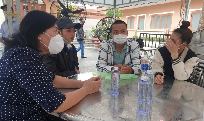 Bà Huỳnh Thị Thanh Phương- Bí thư Thành ủy Thuận An (ngoài cùng bên trái) đang động viên gia đình nạn nhân tử vong trong vụ cháy quán karaoke An Phú tại nhà tang lễ Bộ Quốc phòng.