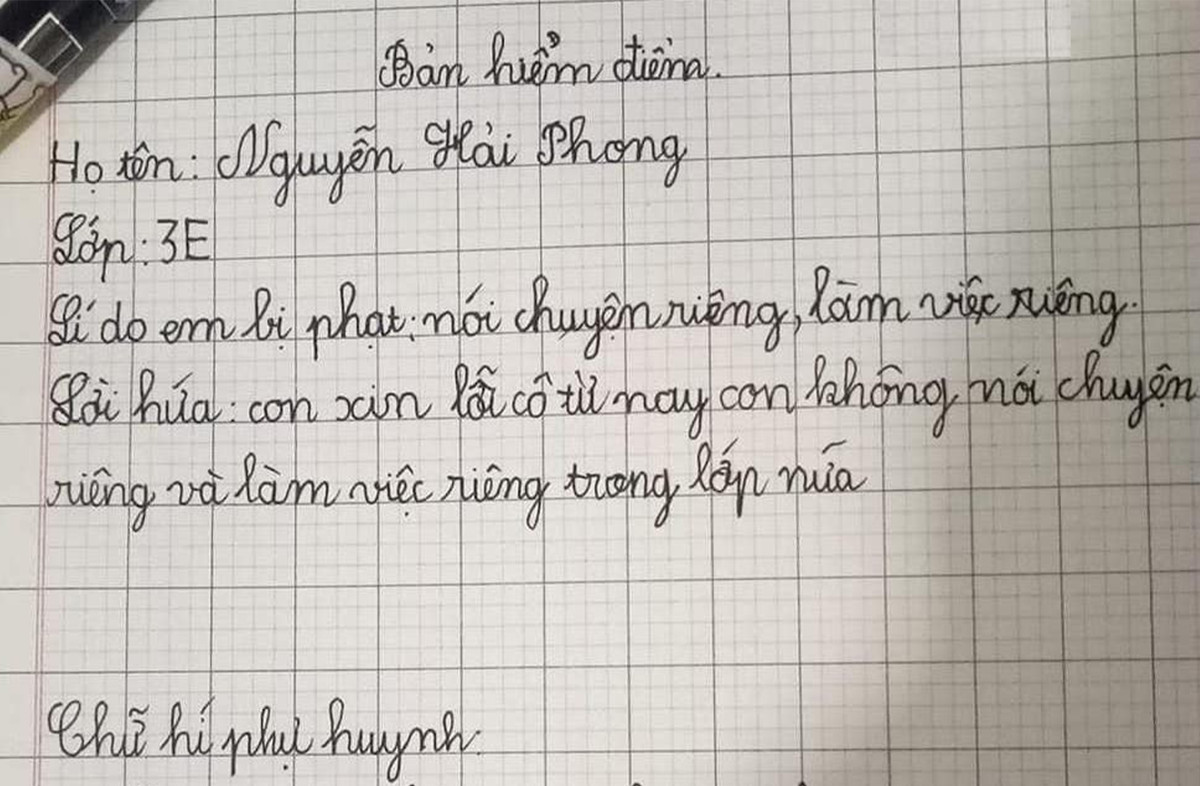 Bản kiểm điểm vẫn luôn là "nỗi ám ảnh" của tất cả các thế hệ học sinh, nhưng có những bản kiểm điểm được viết với giọng văn chân thật, dễ thương khiến bất kỳ ai đọc được cũng phải bật cười. Mới đây, bản kiểm điểm của học sinh Nguyễn Hải Phong lớp 3E gây sốt mạng xã hội bởi những lý lẽ mà học sinh này trình bày.