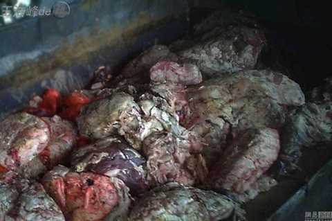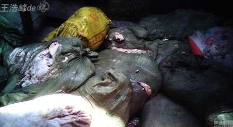 Thịt và mỡ lợn nằm ngổn ngang, có những bao tải nửa kín nửa hở, thậm chí nhiều phần thịt và mỡ đã bám đầy bùn đất, mốc meo...