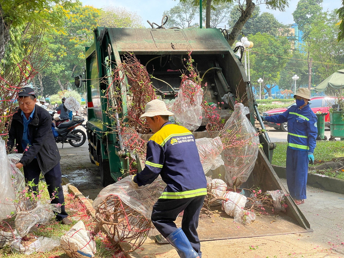 Tết này không có ngày 30 nên trưa nay, 29 tháng Chạp, hàng trăm cây đào, tắc (quất) giá trị lớn tại Công viên Lê Văn Tám (Quận 1) lần lượt bị đưa lên xe rác. Cả người bán, người đi mua hoa và công nhân vệ sinh môi trường cùng chung cảm giác xót xa, tiếc của.