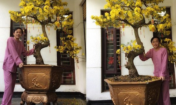 NSƯT Hoài Linh diện áo bà ba, thích thú đứng cạnh chậu mai "khủng" nở hoa vàng rực.