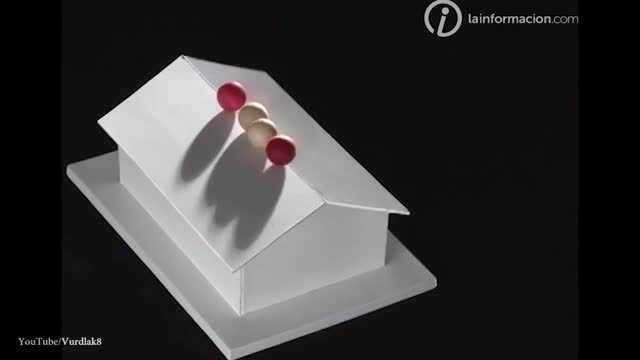 26/07/2016 11:51:00 +07:00Trong video, ba quả bóng khi đặt lên mái nhà không bị rơi xuống mà có thể đứng thăng bằng; đây là một trong những tác phẩm của giáo sư Kokichi Sugihara, đại học Meji, Nhật Bản.
