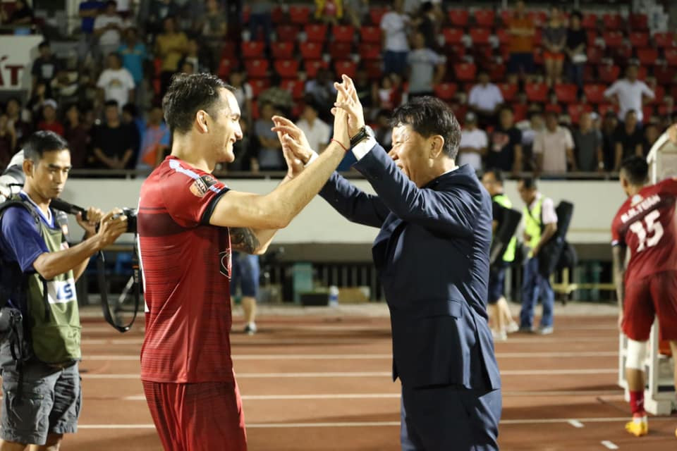 HLV Chung Hae Seong chia vui cùng các học trò sau trận.
