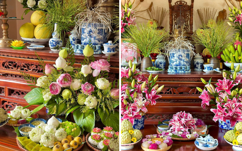 Mỗi mùa trong năm, ban thờ tổ tiên của gia đình chị Ngọc lại có diện mạo mới với những loài hoa đặc trưng, như hoa đào, hoa mai dịp Tết Nguyên đán, hoa sen trong mùa hè, hoa cúc vàng khi thu về... Tất cả đều được chị sắp xếp khéo léo, hài hòa và mang đậm nét văn hóa Việt.