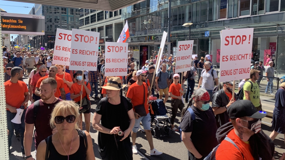 Đám đông người huýt sáo và cổ vũ, tuần hành qua trung tâm thành phố Berlin. Những người biểu tình giương cao những tấm bảng có các khẩu hiệu bao gồm: "Corona, báo động giả", "Chúng tôi bị buộc phải bịt miệng", "Phòng thủ tự nhiên thay vì tiêm phòng" và "Kết thúc sự hoảng loạn của corona - mang lại quyền cơ bản".