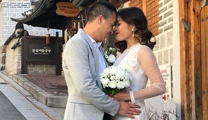Trong tấm ảnh này, MC chương trình Chúng tôi là chiến sĩ mặc váy trắng bó sát, tay cầm bó hoa màu trắng trong khi bạn trai cô diện trang phục vest lịch lãm.