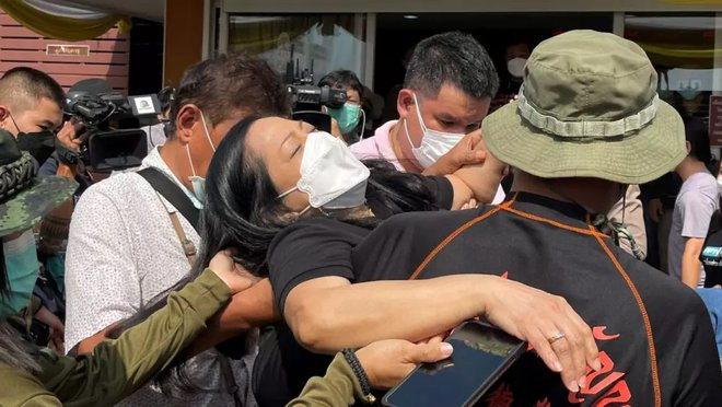 Mẹ và bạn trai suy sụp khi nhận thi thể nữ diễn viên. (Ảnh: Thairath)