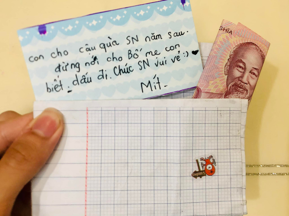 Theo đó, tháng 1 năm sau mới đến sinh nhật cậu, không hiểu vì lý do gì mà cô cháu gái lại quyết định tặng quà và chúc sinh nhật luôn vào thời điểm này. Phần quà hiện kim với trị giá 50 nghìn đồng được gấp gọn trong một “phong thư handmade”, đính kèm lời nhắn vô cùng đáng yêu.