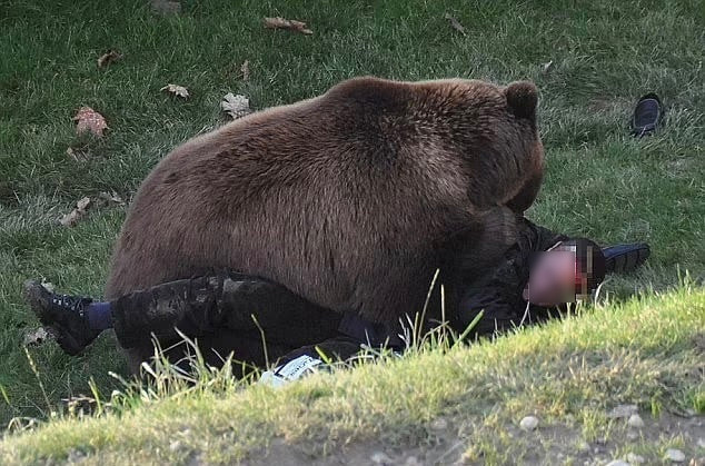 Chú gấu nâu Finn quật ngã Sam Brookes xuống mặt đất và ngoạm vào vai anh.