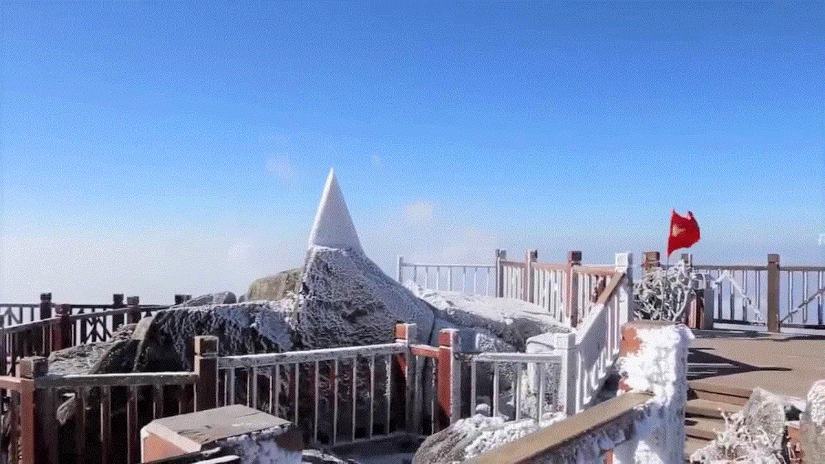Băng trắng xoá phủ khắp mặt sàn và cây cối trên khu vực đỉnh, làm nên cảnh tượng kỳ thú như ở trời Âu.